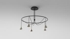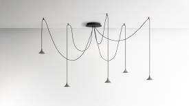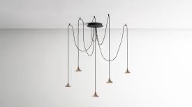 Le lustre libre Unterlinden se compose de cinq éléments de suspension qui mènent tous à un seul point central. Les câbles de 2,5 mètres de long peuvent être disposés librement pour créer des compositions qui suivent différentes dispositions.