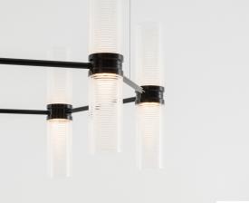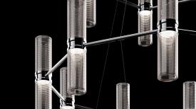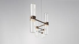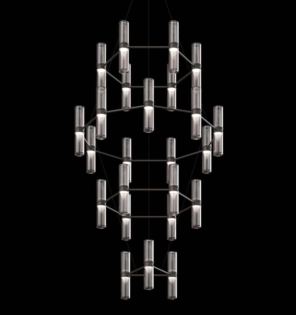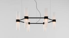 Il s'agit d'une interprétation contemporaine du lustre traditionnel : le savoir-faire du verre s'allie à une forme simple et à un style visuel saisissant pour réinterpréter les technologies de transformation du verre, non seulement à travers des pièces décoratives, mais aussi comme des outils fonctionnels de contrôle et de diffusion de la lumière.