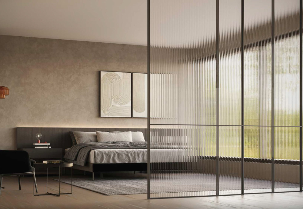 Profilé en aluminium laqué Plomo avec verre texturé Flutex. cloison
