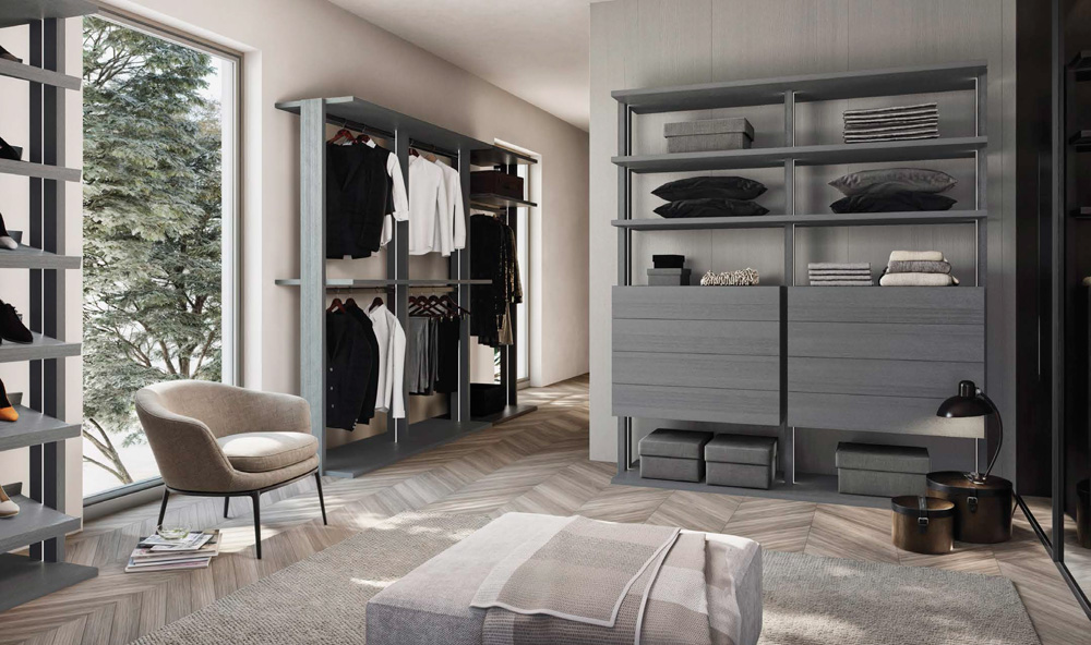 VISTA est un système de dressing élégant, composé de plans horizontaux et verticaux qui s'imbriquent pour former une structure en grille. Cette conception permet d'intégrer différents systèmes de rangement et d'organisation.
