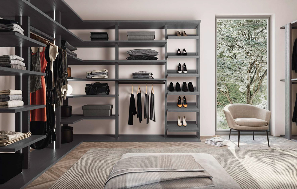 VISTA est un système de dressing élégant, composé de plans horizontaux et verticaux qui s'imbriquent pour former une structure en grille. Cette conception permet d'intégrer différents systèmes de rangement et d'organisation.