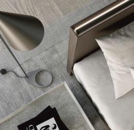 Détail de l'éclairage LED de la tête de lit. Table de chevet AD en chêne Barro à pores ouverts et plateau en porcelaine Vulcano Ceniza. lit et tête de lit