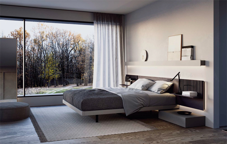 Tête de lit en chêne brun avec panneaux latéraux avec étagères à lattes et séparateurs en métal laqué noir. Tables de chevet Mitra, cadre Neu et étagère linéaire en laque Arena.