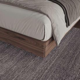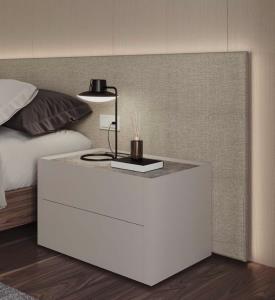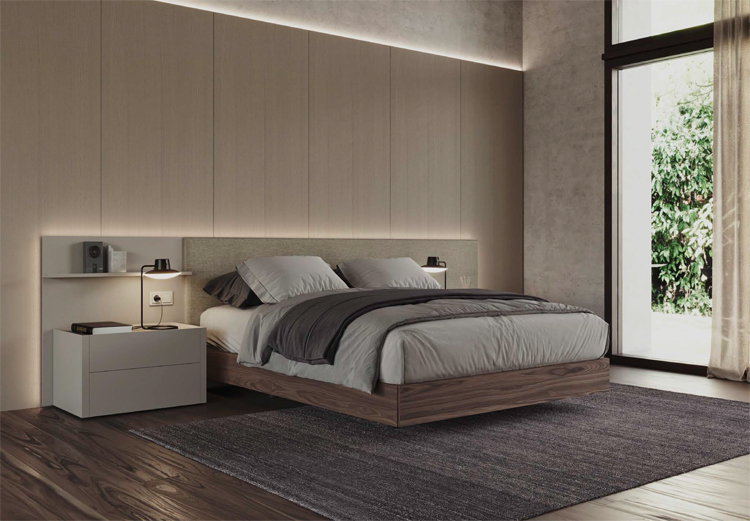 Page précédente : Tête de lit Art revêtue de tissu Crevin Libra 08 avec panneau d’étagère gauche les deux sont laqués Arena. Piètement Meet en noyer antique.