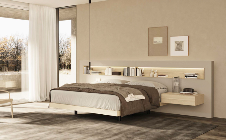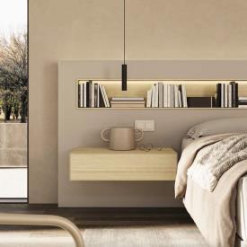 Page précédente : Tête de lit Box en laque Arena et Chêne 9. Tables de chevet et socle Mitra en Chêne 9. Table de chevet Mitra finition chêne et détail frontal de l'insert d'étagère de tête de lit.