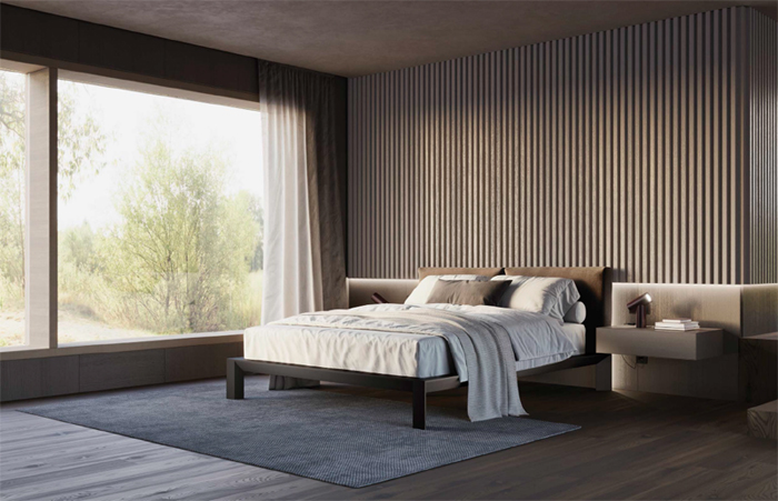 Page précédente : Composition avec tête de lit murale revêtue de tissu Crevin Libra 11 et structure Ethan en laque noire à pores ouverts, avec table de chevet Mitra en laque Barro à pores ouverts. Lambris combinant panneaux à lattes et panneaux plats, tous en finition laque Barro à pores ouverts.