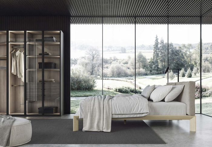 Lit Ethan avec structure en chêne 9 et tête de lit capitonnée en Crevin libra 05 lit et tête de lit