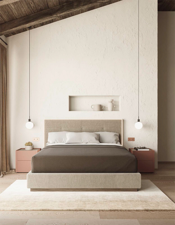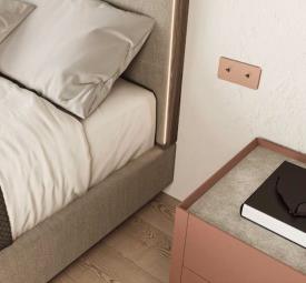 Ensemble comprenant une tête de lit Mitra revêtue de tissu Crevin Libra 08, un cadre périmétral en noyer antique, un sommier revêtu de tissu Crevin Libra 08 avec plinthe, et des tables de chevet AD en laque Tina avec plateaux en porcelaine Blaze Grey.