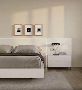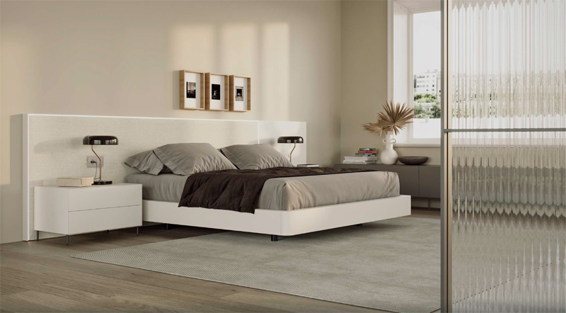 Tête de lit Mitra revêtue de tissu Crevin Libra 05 avec cadre périmétral laqué blanc cassé, structure Orsay et Tables de chevet Mitra laquées blanc cassé avec pieds en métal noir. lit et tête de lit