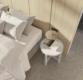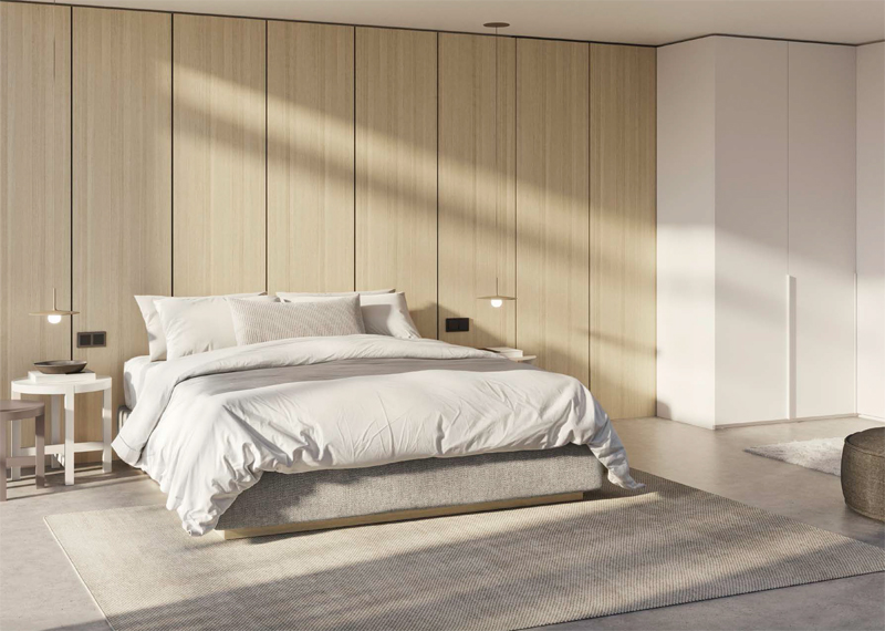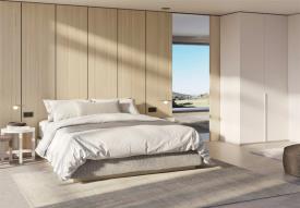 Composition V. Panneau mural et revêtement en chêne 9. Cadre capitonné et tables de chevet Quad en Barro et laque blanc cassé. tête de lit