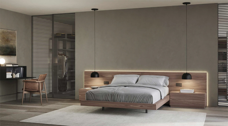 Composition en noyer antique : tête de lit plate, tables de chevet F-10 et cadre. Complété par un bureau Mitra en laque noire à pores ouverts.