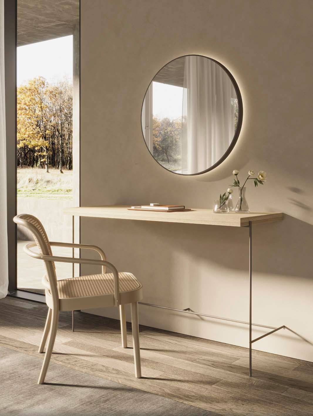 Composition comprenant une coiffeuse/bureau Fil en chêne naturel avec structure en métal laqué Barro et un miroir Reflect avec cadre laqué Barro.