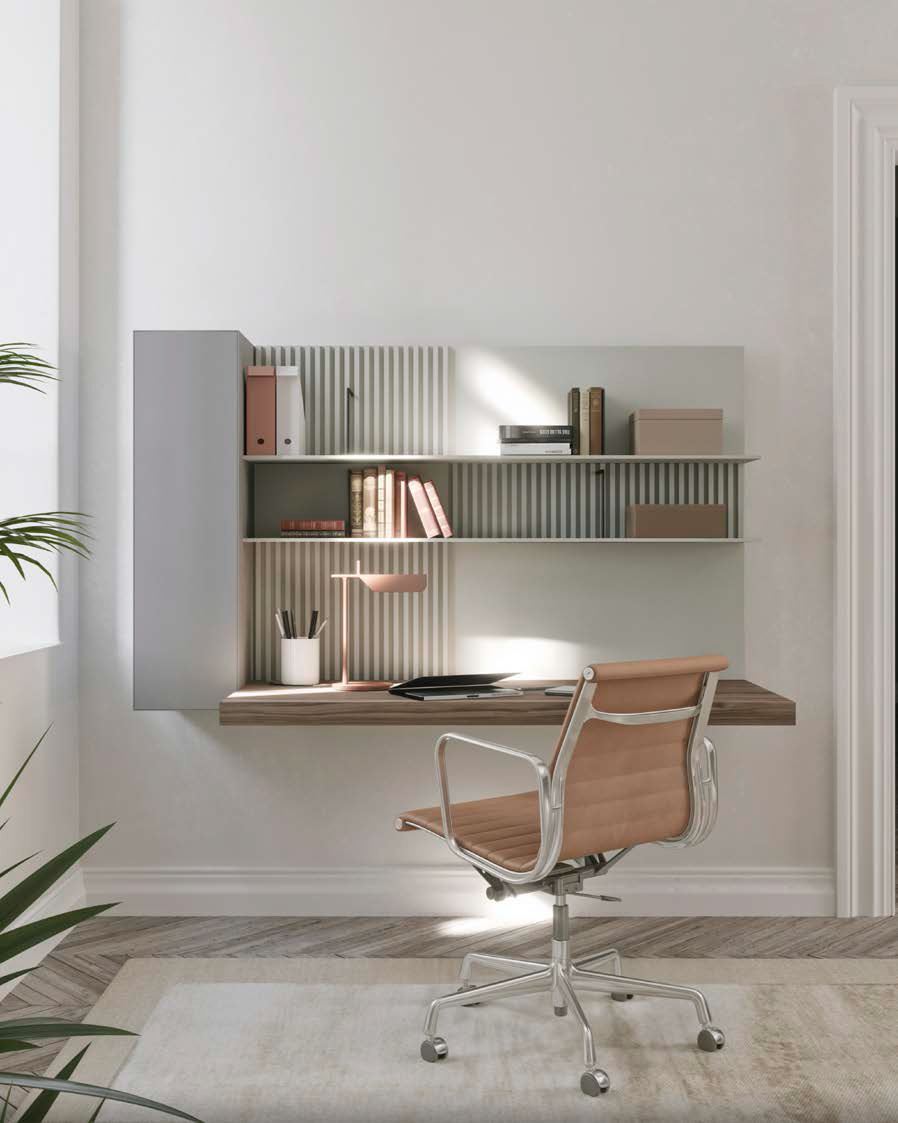 Aménagement bureau avec module vertical Mitra laqué Cemento, plateau de bureau en noyer antique et étagères Art de la collection « Day » laquées gris cendré avec entretoises en métal laqué Plomo.
