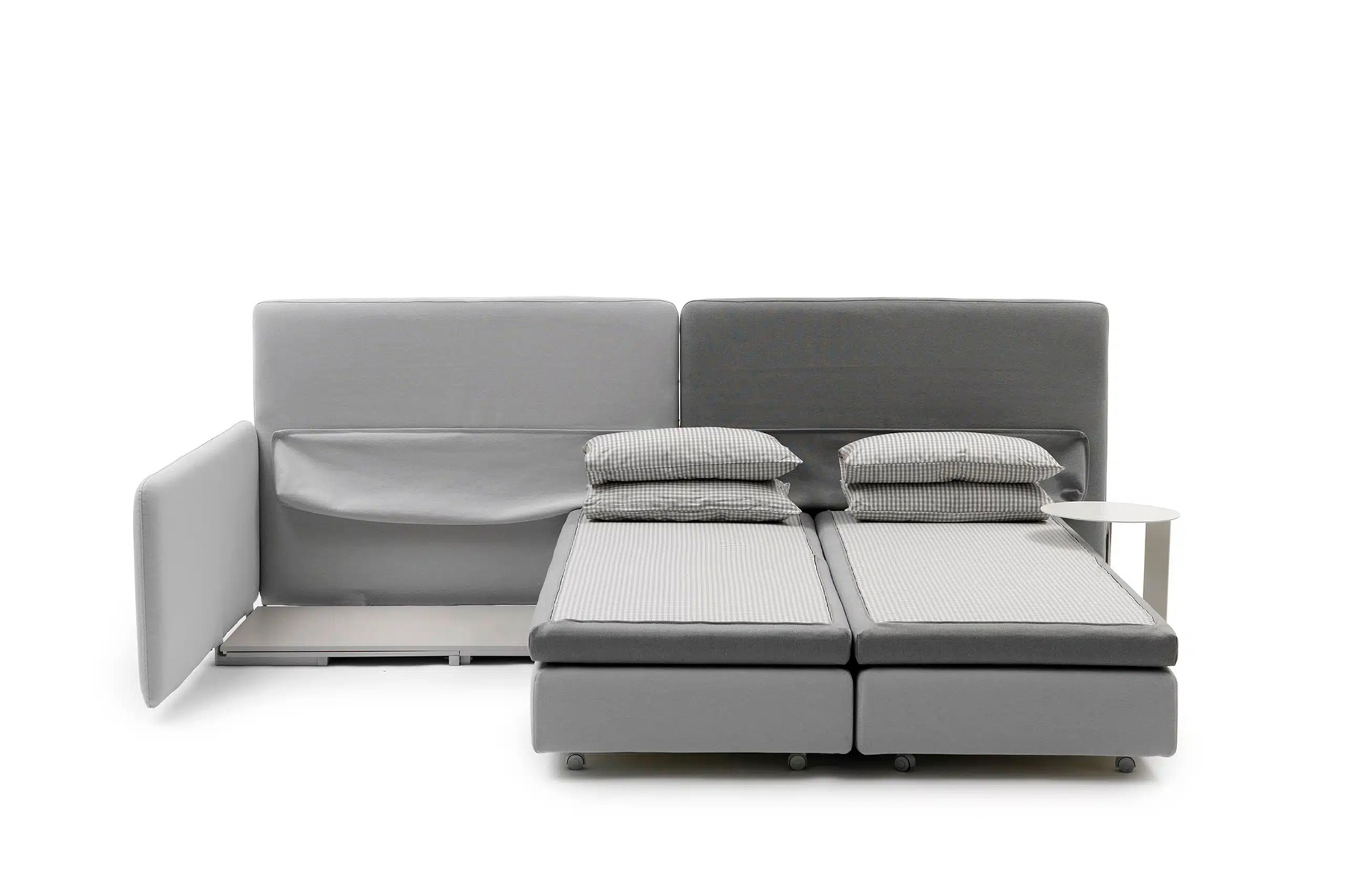 A-Accommodating, B-beautiful, C-omfortable, comme il se doit dans un salon. En quelques gestes, ce canapé se transforme en lit simple, lit double ou lits jumeaux. Son large dossier s'ouvre sur une poche qui se transforme en coussin lombaire confortable. Conçu par Giulio Manzoni pour de multiples configurations et usages, ABC est disponible avec un accoudoir à droite ou à gauche, offrant un système relaxant entièrement dépourvu de structure métallique. ABC : un canapé-lit aussi simple et essentiel que l'alphabet.