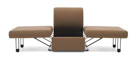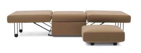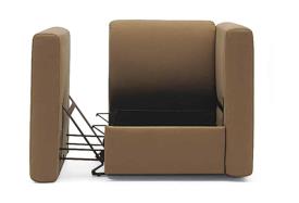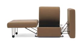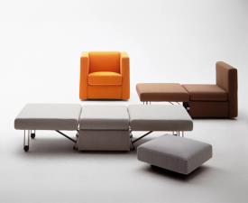 Un cube doux et confortable, conçu par Giulio Manzoni , dissimule un nouveau type de siège convertible : fauteuil, méridienne et lit une place . Acca s’adapte facilement aux besoins et se déplace aisément d’une pièce à l’autre grâce à ses roulettes et à ses dimensions compactes qui lui permettent de passer sans problème les portes standard. Le coussin d’assise, muni de pieds, se transforme en table de chevet rembourrée et l’espace en dessous peut accueillir le linge de lit.