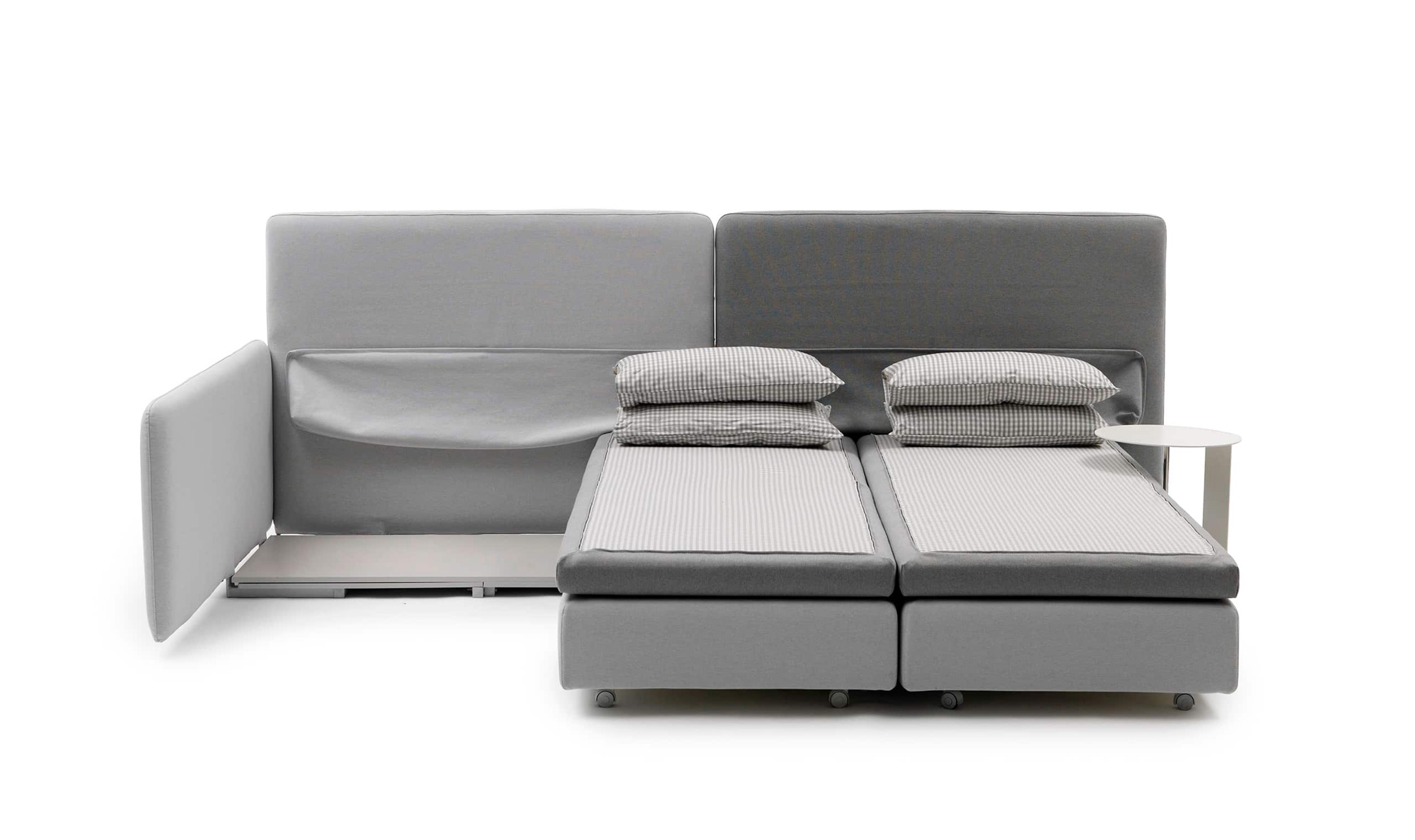 A-Accommodating, B-beautiful, C-omfortable, comme il se doit dans un salon. En quelques gestes, ce canapé se transforme en lit simple, lit double ou lits jumeaux. Son large dossier s'ouvre sur une poche qui se transforme en coussin lombaire confortable. Conçu par Giulio Manzoni pour de multiples configurations et usages, ABC est disponible avec un accoudoir à droite ou à gauche, offrant un système relaxant entièrement dépourvu de structure métallique. ABC : un canapé-lit aussi simple et essentiel que l'alphabet.