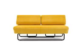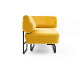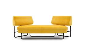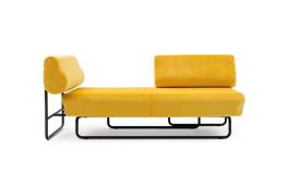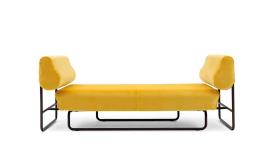 Paolo Imperatori (2022) signe un siège qui se veut un jeu tridimensionnel : grâce à un mécanisme simple, les coussins du dossier pivotent pour se transformer en accoudoirs, conférant à ce lit de jour une personnalité versatile et un caractère affirmé, évoquant l’austérité des lits traîneaux de style Empire. La structure est en métal bruni, le rembourrage en mousse de polyuréthane à différentes hauteurs, tandis que le revêtement est amovible et disponible en plusieurs coloris.