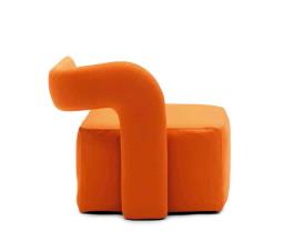 Une bande en forme de virgule, suspendue à l'assise, se prolonge en accoudoirs et en dossier d'un petit fauteuil .