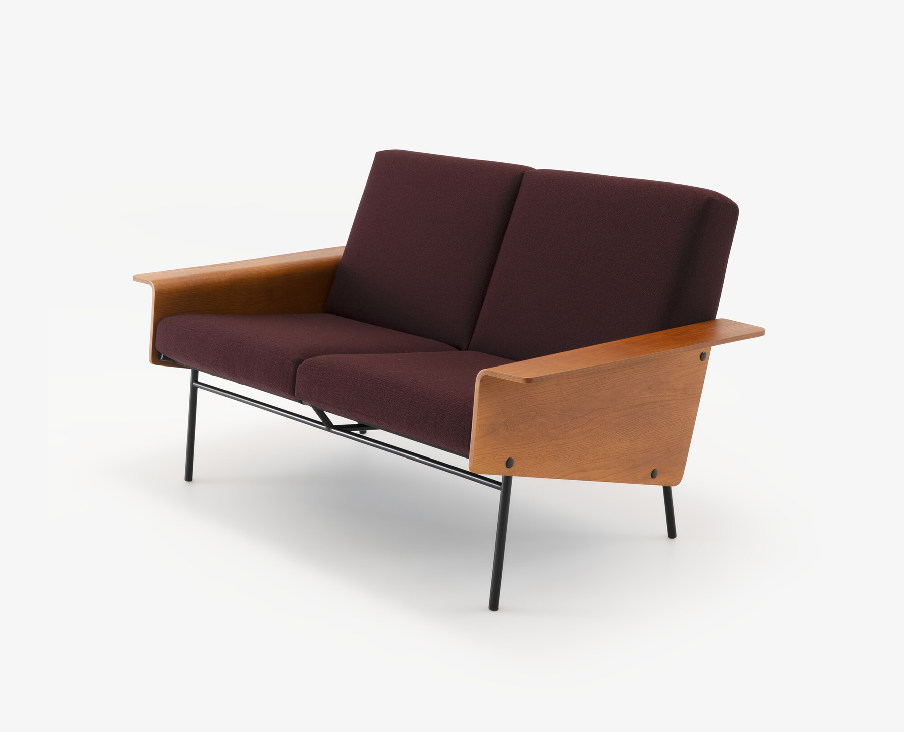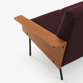 Cinna Design. Pierre Guariche - Canapé accoudoirs bois Dimensions : l 137 x h 77 x p 84 cm G10 est un modèle conçu en 1953 pour Airborne. Dans sa version rééditée, le pied central a été retiré pour raison esthétique et technique. A noter l’assise en pente inclinée, de hauteur 44 cm en partie haute, 38 cm en partie la plus basse, qui accentue un confort remarquable. L’utilisation de sangles dans le dos permet une assise parfaite. STRUCTURE La structure de dossier est composée de panneaux multiplis parementés de mousse polyuréthane et de ouate polyester 110 g/m². La structure de piètement est mécano-soudée laquée époxy noir satiné. Les accoudoirs sont en multiplis de hêtre moulé plaqué frêne teinté. CONFORT Suspension d’assise par sangles élastique. L’assise et le dossier sont composés de mousses polyuréthane haute résilience Bultex (38 kg/m3 - 3,6 kPa et 38 kg/m3 - 2,8 kPa). Parementage ouate polyester 110 g/m². canapé
