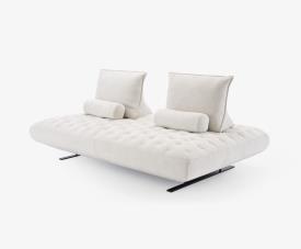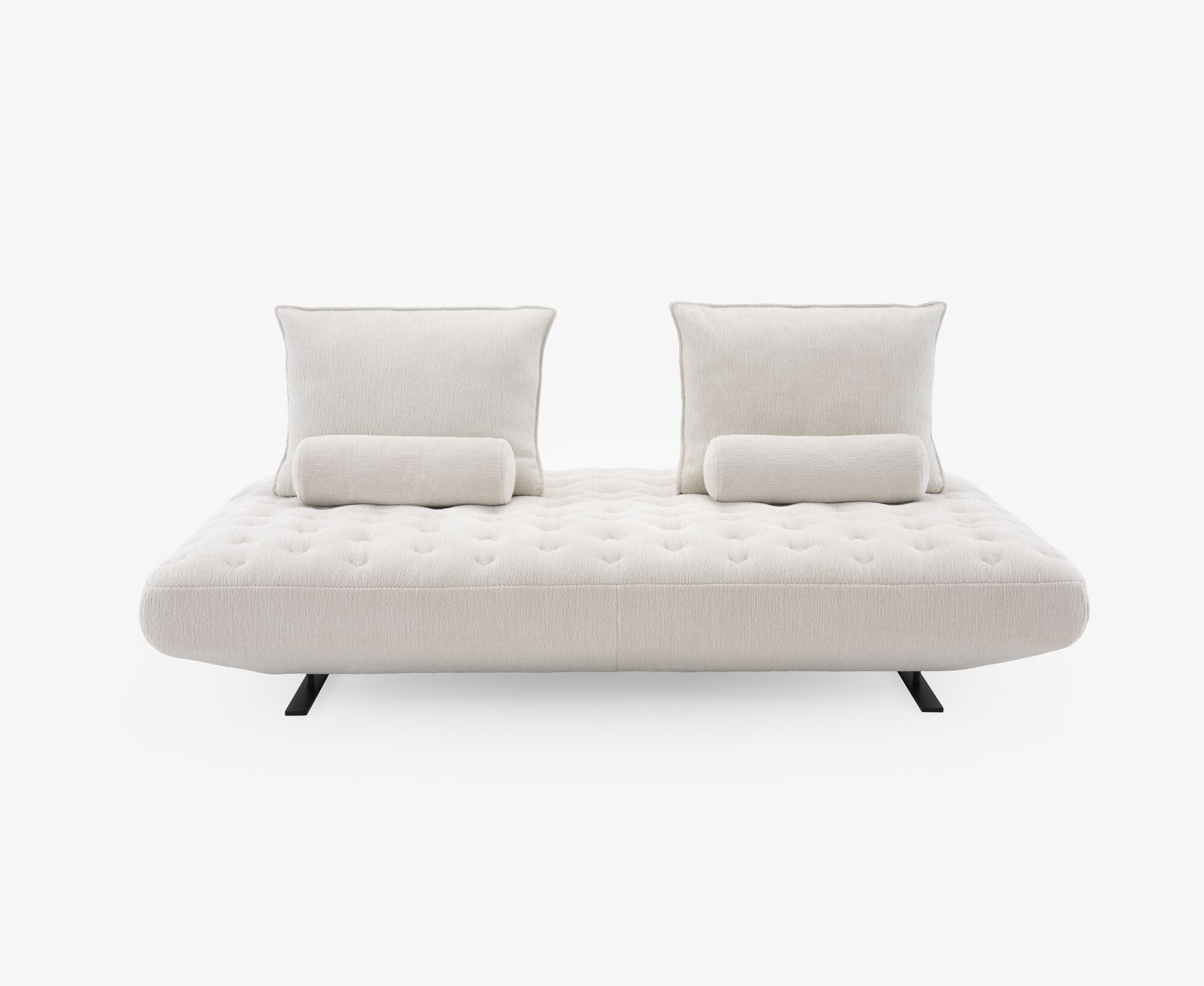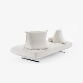 Cinna Design. Christian Werner Dimensions : l 205 x h 87 x p 105/125 cm Une assise monobloc matelassée, ultra souple et moelleuse, offrant un confort optimal. Sans l’empilement de coussins, son design épuré et moderne s’éloigne de la fonction canapé-lit du Prado. Il peut même être utilisé sans coussins, pour obtenir une assise pure matelassée au style sobre et raffiné. STRUCTURE ET CONFORT La structure est composée de panneaux de lamelles à trois couches croisées, sanglées et recouvertes d’un parement en mousse polyéther d’une densité de 40 kg/m³. L’assise est constituée de mousse polyuréthane haute résilience Bultex, avec des densités de 36 kg/m³ et 38 kg/m³, et une résistance de 2,8 kPa. Le coussin de dos est fabriqué en mousse injectée d’une densité de 60 kg/m³, surmoulée sur un insert métallique équipé de sangles élastiques. Il est recouvert d’une galette de plumes d’oie neuves, composée de 10 % de duvet et 90 % de plumettes, ainsi que d’une couche de ouate polyester de 110 g/m² compartimentée. Ce coussin est doté d’un système antiglisse. Le cale-reins est garni de plumes d’oie neuves, avec une répartition de 10 % de duvet et 90 % de plumettes. En option, le coussin d’accoudoir est réalisé en mousse polyuréthane haute résilience Bultex d’une densité de 35 kg/m³, et recouvert d’une ouate polyester de 200 g/m². COUTURE / HOUSSE Housse matelassée de ouate polyester 300 g/m² et de mousse polyuréthane hyper-souple (45 kg/m3 - 1,8 kPa). Plateau supérieur piqué avec un motif en V réalisé par un automate de piqûre programmé. Déhoussable par un professionnel. La version piquée présente une housse matelassée, cousue en sens travers, ce qui évite toute couture sur l'assise. Une seule couture traverse le centre, mais elle se situe sur la structure du canapé. Dans cette version, la fonction permettant de retourner le coussin pour le transformer en couchage est supprimée, et la base est désormais un monobloc. Les pieds du canapé seront identiques à ceux du modèle Prado. Le cuir n'est pas envisageable en raison du matelassage trop fractionné. Le dossier, quant à lui, bénéficie d'un système antiglisse et reste identique à celui du Prado. Comme pour ce dernier, certaines options de tissus seront limitées pour les bases.