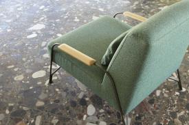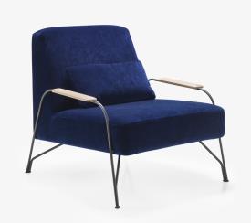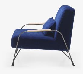 Cinna Design. Evangelos Vasileiou Dimensions : l 73,5 x h 77 x p 88 cm Les années 50 revisitées par Evangelos Vasileiou avec ce fauteuil bien nommé Humphrey. Classique et bien coupé comme le pardessus du fameux acteur. Le dessin du fauteuil Humphrey revendique une certaine modernité et une inscription dans son temps par son efficacité et son économie de moyens. Les deux volumes massifs de l'assise flottent dans l'air, suspendus à une structure fine et élégante, un geste comme un coup de crayon d'un calligraphe. Au fil d'acier et au tissu de l'assise, un troisième matériau s'invite pour l'accoudoir : le bois sculpté dans la masse, matière noble et accueillante, fonctionne comme une ponctuation à l'écriture fluide de la structure. STRUCTURE Pour le fauteuil, structure mécano soudée, piètement en fil d'acier de 12 mm laqué Epoxy finition ''canon de fusil'', accoudoir en chêne teinté noir ou naturel. La chauffeuse est systématiquement équipée de part et d’autre d’une pièce de liaison en acier permettant de la solidariser à une ou deux autres chauffeuses. CONFORT : -Assise : sangle élastique, mousse polyuréthane haute résilience (38 kg/m3 - 3.6 kPa), parementée de ouate polyester110gr/m². -Dossier : mousse polyuréthane haute résilience (26 kg/m3 - 1.4 kPa), parementée de ouate polyester 110gr/m². COUTURE / HOUSSE Housse surpiquée, surpiqûre baguette, déhoussable par un professionnel.