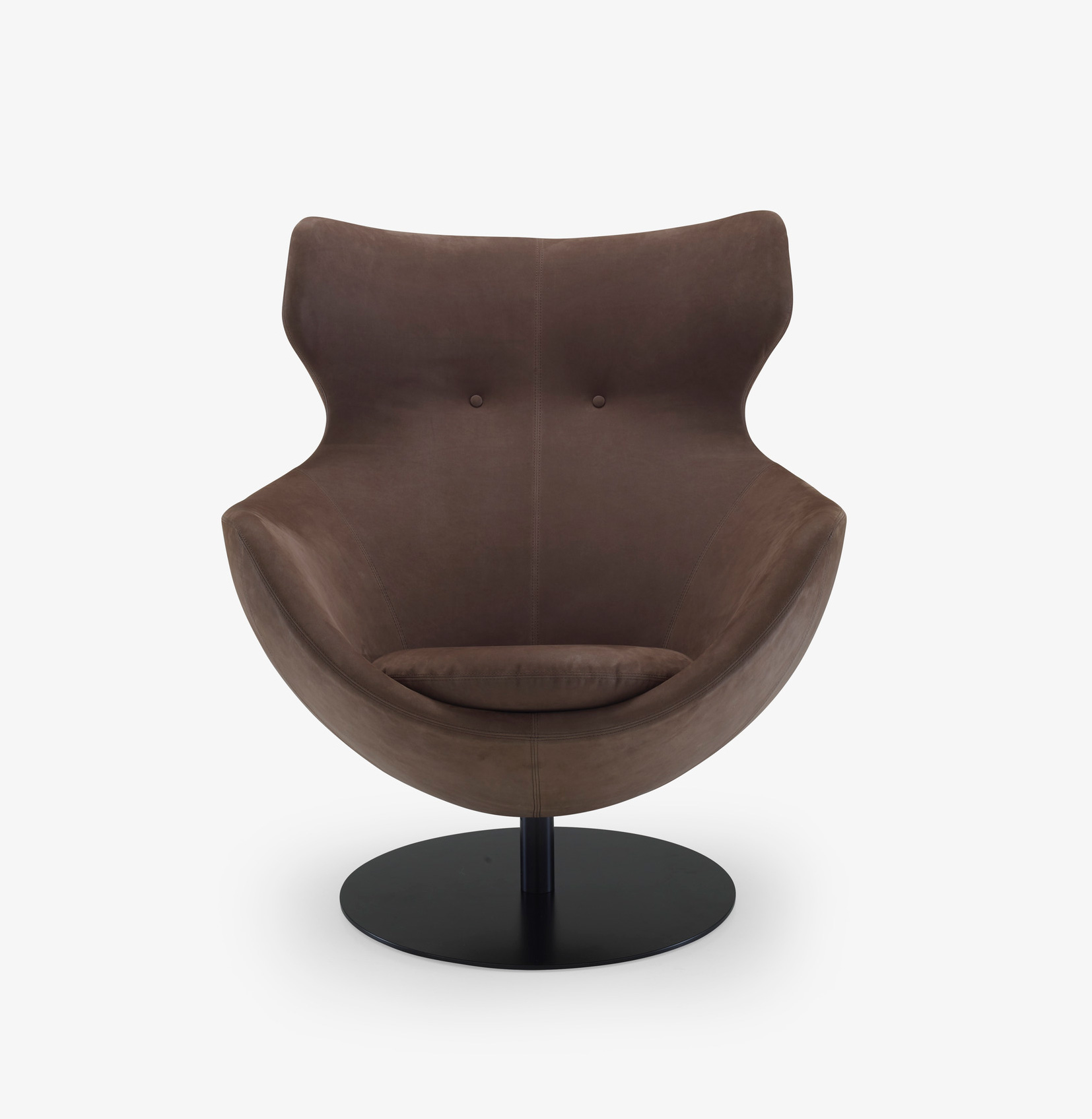 Structure en fil d’acier surmoulée de mousse polyuréthane injectée. Parementage ouate polyester 110 g/m2. Piétement socle pivotant en acier épaisseur 8mm, laqué époxy noir satiné.
