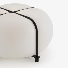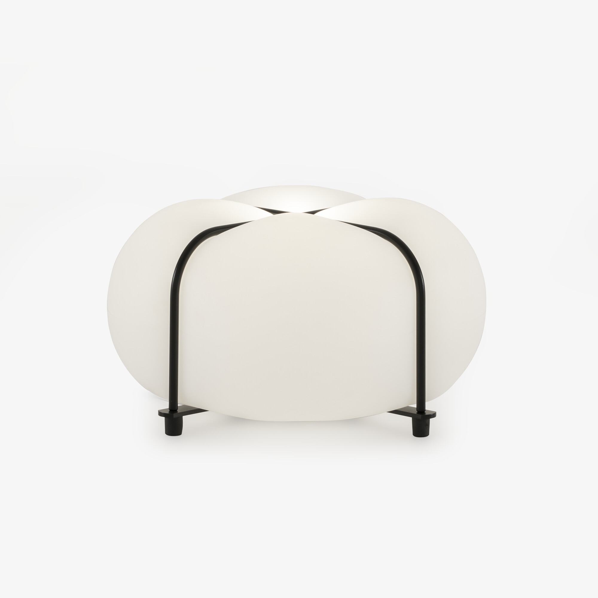 Cinna Design. Rémi Dehaene Dimensions : l 43 x h 24,5 x p 43 cm TRÈFLE DE LUMIÈRE se distingue par sa construction ingénieuse, où une structure métallique agit comme une cage, utile à l’assemblage de la lampe, conférant au diffuseur en verre en polyéthylène l’esprit d’un coussin gainé. Cette approche novatrice offre au verre un caractère organique de tissus magnifié par ses qualités de diffusion, créant une pièce unique qui se démarque par son originalité formelle. Coussin lumineux en polyéthylène (PE) blanc rotomoulé finition microbillée, "enfermé" à l’intérieur d’une structure de tubes d’acier ø10 mm cintrés et soudés, finition laqués Epoxy noir satiné. Afin de standardiser les productions, la structure métallique de cette version indoor bénéficie du même traitement que la version outdoor : traitement phosphatant anticorrosion et de deux couches de peinture Epoxy ; soit une sous-couche anticorrosion + une couche de finition. Câble PVC transparent de 3 mètres. Interrupteur à main. Livré avec une ampoule LED 11 W E27 température de couleur 3000 K (blanc chaud), 1060 lumens. Ampoule non dimmable. lampe à poser