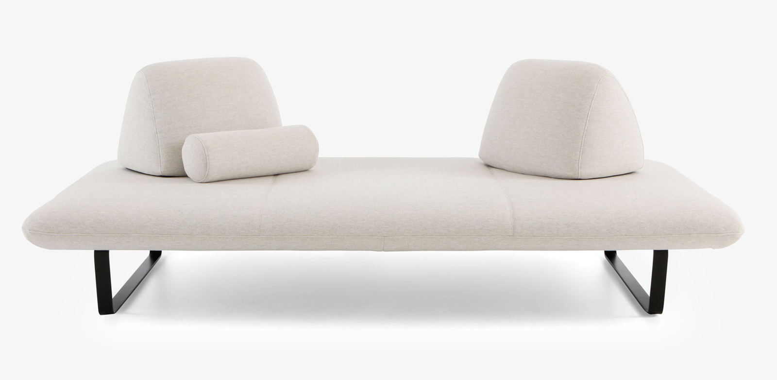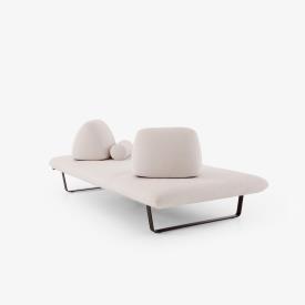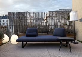 Cinna Design. Christian Werner Dimensions : l 240 x h 81 x p 120 cm Canapé Outdoor dont le confort utilise tout notre savoir-faire acquis en Indoor. Une grande plateforme de 240 cm x 120 cm, suspendue par des lattes en fibres de verre et de mousse Bultex, montée sur un piétement en aluminium noir mat, recouvert d’une housse déperlante. Les coussins de dos, tout en mousse et lestés par une plaque en bois de 15 mm afin de donner une surface d’appuis au matériau antiglisse sont protégés par une sous housse déperlante. La forme particulière de ces coussins, avec leurs 2 pentes différentes, permet d’obtenir un confort variable selon l’usage : une position ''lounge'' sur la pente la plus forte ou une position plus ''assise'' pour la pente plus verticale. Ils permettent donc de trouver la position idéale, en les déplaçant sur la plateforme. Le grand canapé est tarifé avec 2 coussins de dos et un traversin. Il peut également se traiter en bicolore et/ou en bi-matière. La collection est complétée par un pouf de 120 cm x 120 cm qui peut permettre de faire une composition d’angle. STRUCTURE Structure d’assise constituée d’un cadre mécano-soudé. Structure de coussin de dossier constituée d’un panneau de particules. CONFORT Suspension par lattes de polypropylène renforcées par de la fibre de verre. L’assise est constituée de mousses polyuréthane haute résilience Bultex (38 kg/m3 - 3,6 kPa et 38 kg/m3 - 2,8 kPa). Le coussin de dossier est réalisé en mousses polyuréthane haute résilience Bultex (42 kg/m3 - 4,8 kPa et 26 kg/m3 - 1,4 kPa) parementées de mousse polyuréthane hyper-souple (45 kg/m3 - 1,8 kPa). La face inférieure est équipée d’un système antiglisse. Le traversin est constitué de mousse polyuréthane haute résilience Bultex (26 kg/m3 - 1,4 kPa). COUTURE / HOUSSE Sous-housse en toile déperlante, assurant l’imperméabilité de l’article (coussin de dossier et traversin compris). Housses matelassées de ouate polyester 110 g/m² . Surpiqûre baguette et double-aiguilles pour l’assise et le coussin de dossier, surpiqûre baguette pour le traversin. Déhoussable par un professionnel. canapé extérieur outdoor