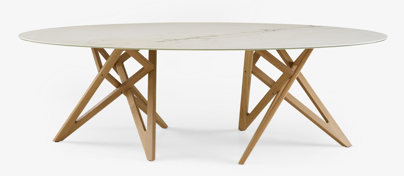 La table de repas Ennea (Ennea signifie le chiffre 9 en grec) repose sur un piètement constitué de trois triangles ''rectangles'' identiques en bois massif. Trois triangles, trois cotés, ces neuf segments forment neuf vecteurs, neuf directions dans l'espace qui forment un agencement à la fois simple et sophistiqué. La construction rappelle la structure pyramidale d'un cristal, légère et robuste. C'est d'équilibre et de tension qu'il s'agit ici, plus que d'un dessin statique. L'assemblage est simple mais donne une impression de sophistication. Cette table peut accueillir de 6 à 10 couverts selon les dimensions.