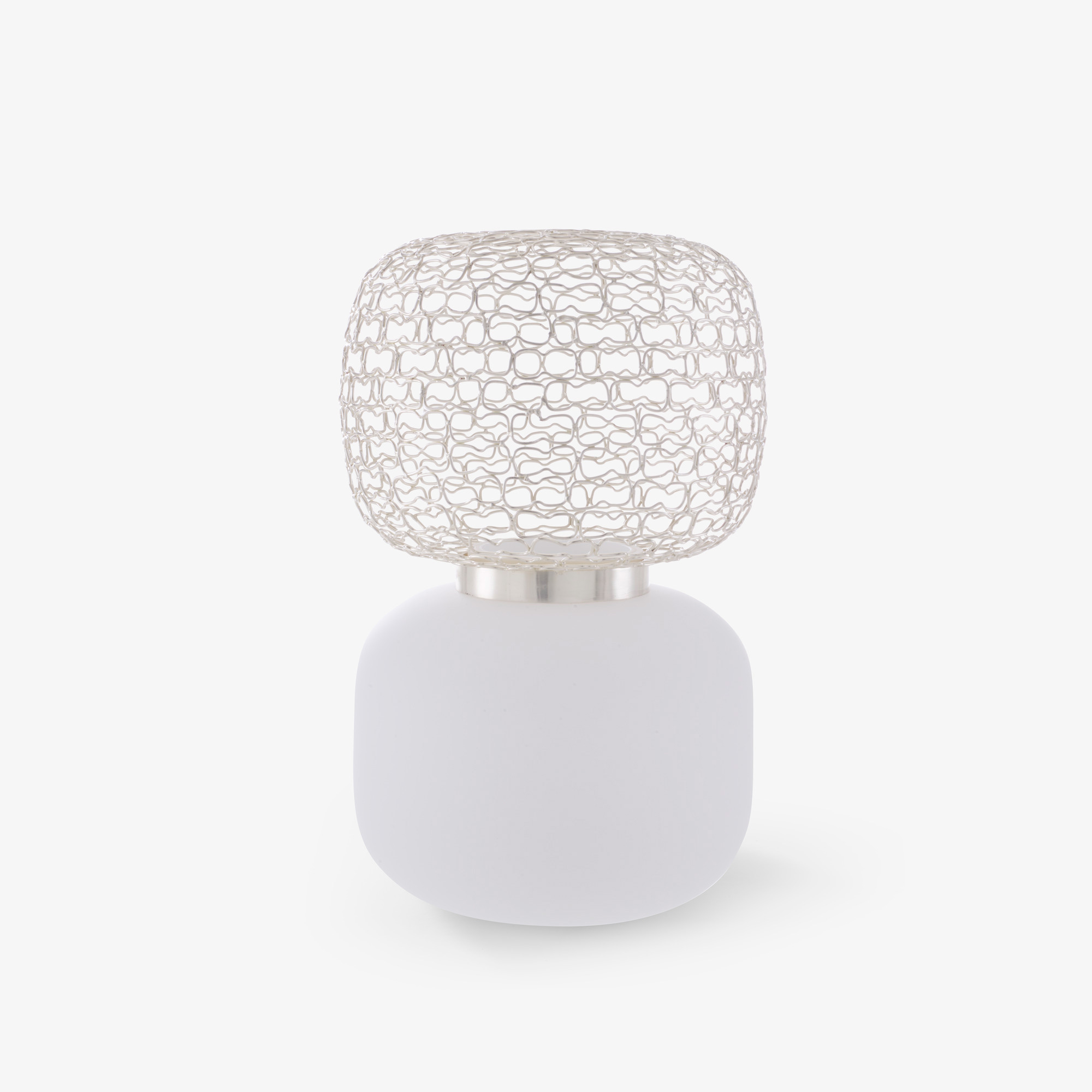 En superposant deux objets (une sphère en maille de laiton de fabrication artisanale et une sphère de même dimensions en opaline) on obtient un vase surmonté d'une résille où viennent se piquer les fleurs, permettant ainsi des arrangements créatifs. Individuellement, chaque objet peut aussi être une lampe à poser, l'opaline diffusant alors une lumière douce et uniforme, et la maille projetant l'ombre de ses motifs de façon très décorative ! (voir chapitre Luminaires).