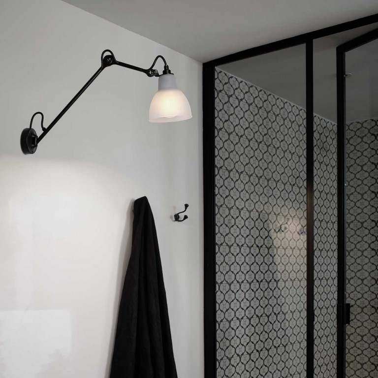 Montée sur un long bras oblique pivotant, la Lampe Gras N°122 Bathroom s’intègre à toutes les morphologies de salle de bain.