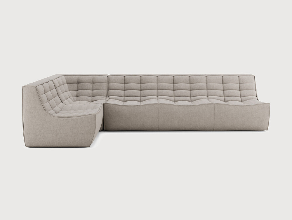 Composition canapé gauche : module 1 place + module d'angle carré à 90° + module 3 places. Des connecteurs inclus pour relier les modules du canapé.