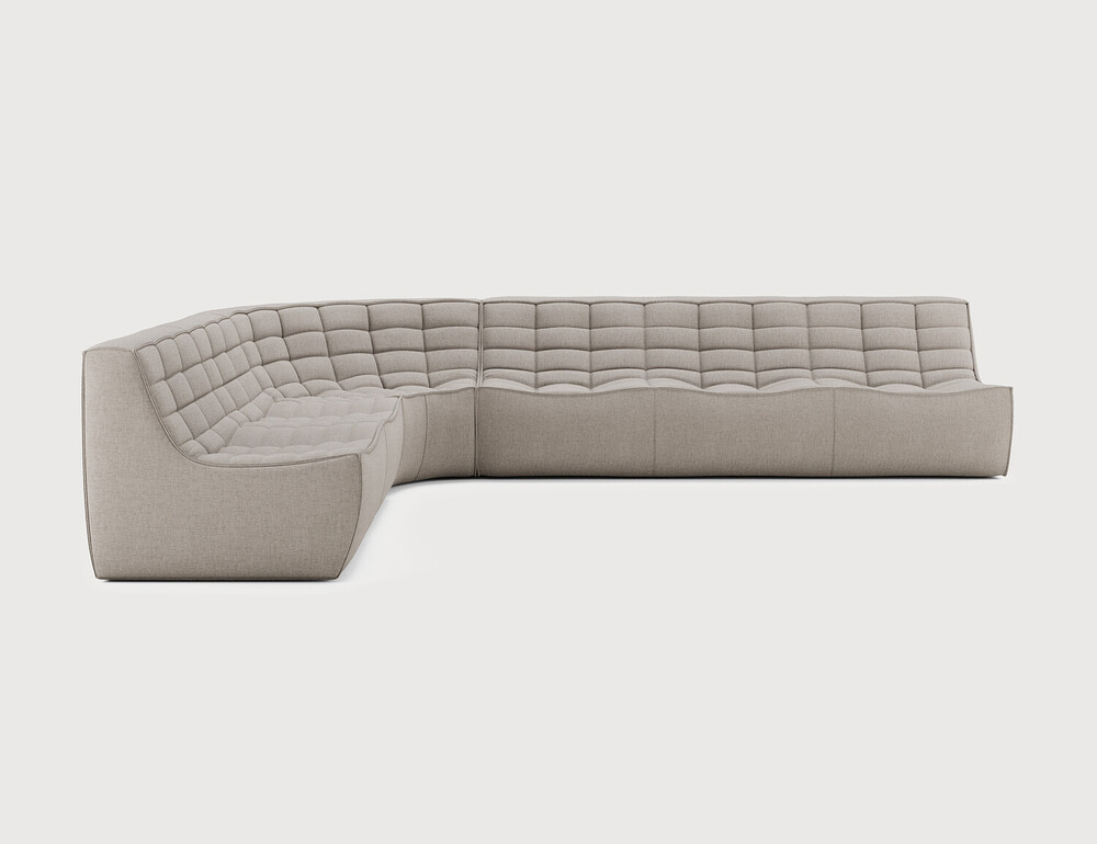 Ethnicraft Design. Jacques Deneef - Canapé modulaire N701 Dimensions : l 330 x h 76 x p 260 cm Le canapé N701 offre un design chaleureux qui respire le confort et la détente. En combinant les modules aux dimensions variées, vous avez une infinité de possibilités dès lors qu'il s'agit de créer votre propre style d'intérieur. Conçu par Jacques Deneef, il est disponible en plusieurs couleurs et matières avec des options pré-configurées ou entièrement personnalisable. Composition canapé gauche : module 2 places + module d'angle arrondi à 90° + module 3 places. Des connecteurs inclus pour relier les modules du canapé. Tissu réalisé à partir de coton recyclé avec des fibres supplémentaires pour des performances techniques. canapé modulaire