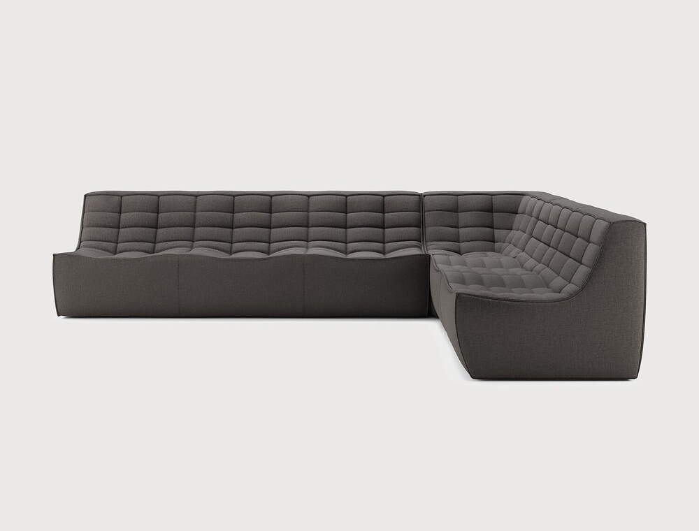 Composition canapé droit : module 3 places + module d'angle carré à 90° + module 2 places. Des connecteurs inclus pour relier les modules du canapé.