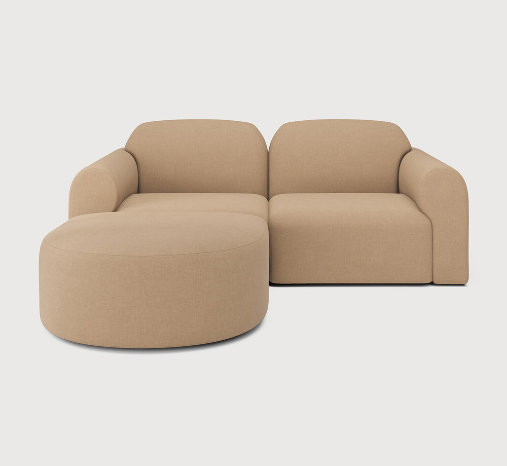 Composition canapé gauche : module d'extrémité avec accoudoir en L + module d'extrémité avec accoudoir en R + repose-pied semi-circulaire.