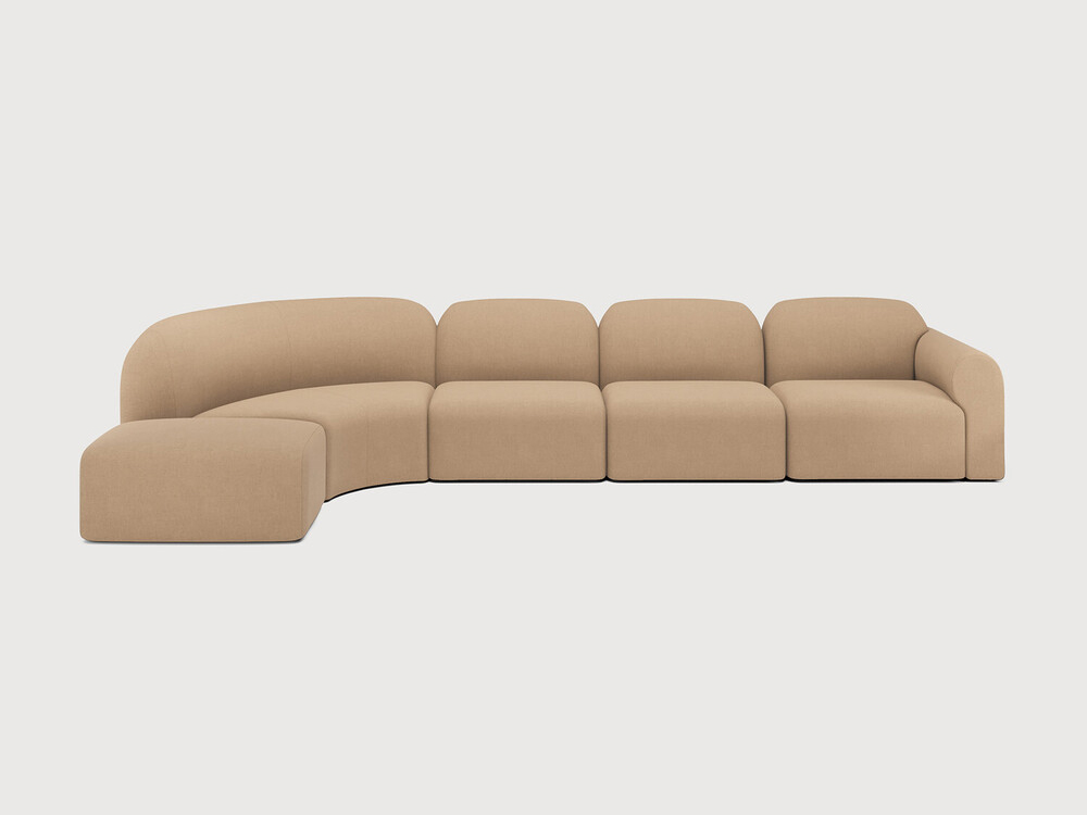 Composition canapé gauche : 2 modules 1 place + module d'angle arrondi à 90° + module d'extrémité avec accoudoir en L + repose-pied.