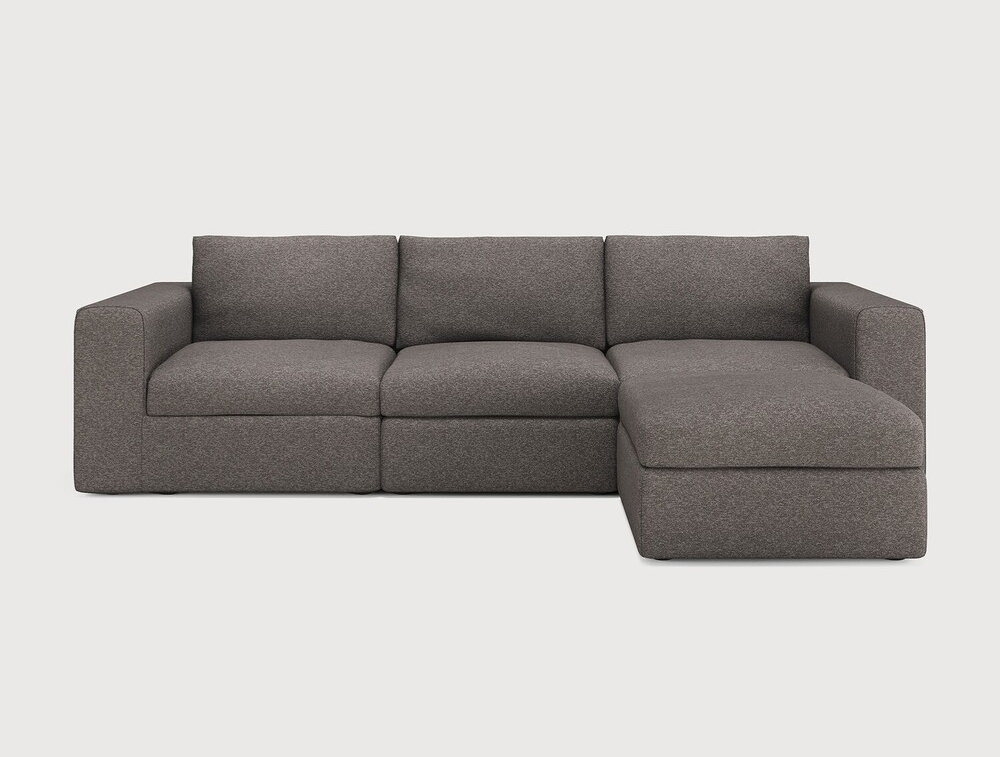 Composition canapé droit : module d'extrémité avec accoudoir en L + module 1 place + accoudoir d'extrémité avec accoudoir en R + repose-pied. Tissu réalisé à partir de coton recyclé avec des fibres supplémentaires pour des performances techniques. Des connecteurs inclus pour relier les modules du canapé.