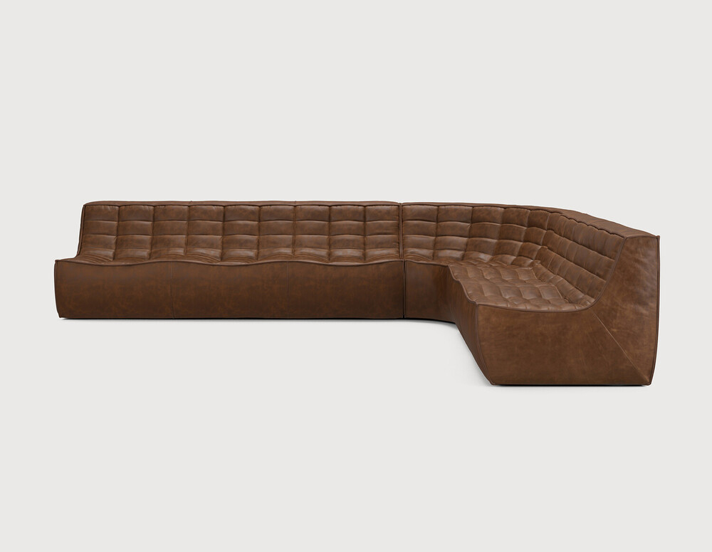 Composition canapé droit : module 3 places + module d'angle arrondi à 90° + module 1 place. Des connecteurs pour relier les modules.