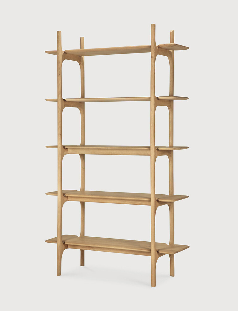Ethnicraft Design. Alain van Havre - Etagère PI Dimensions : l 110 x h 187 x p 39 cm La collection PI rend hommage au design du vivant en conservant la force, les courbes et les lignes créées par la nature. Des formes intrigantes se dessinent dans cette finition polie et imparfaite, à la fois élégante et stylée. Chaque modèle PI est fini à la main pour garantir le respect du caractère unique du bois. L'étagère PI propose une surface tout en équilibre pour disposer vos souvenirs les plus précieux. Chêne massif avec finition huilée. étagère