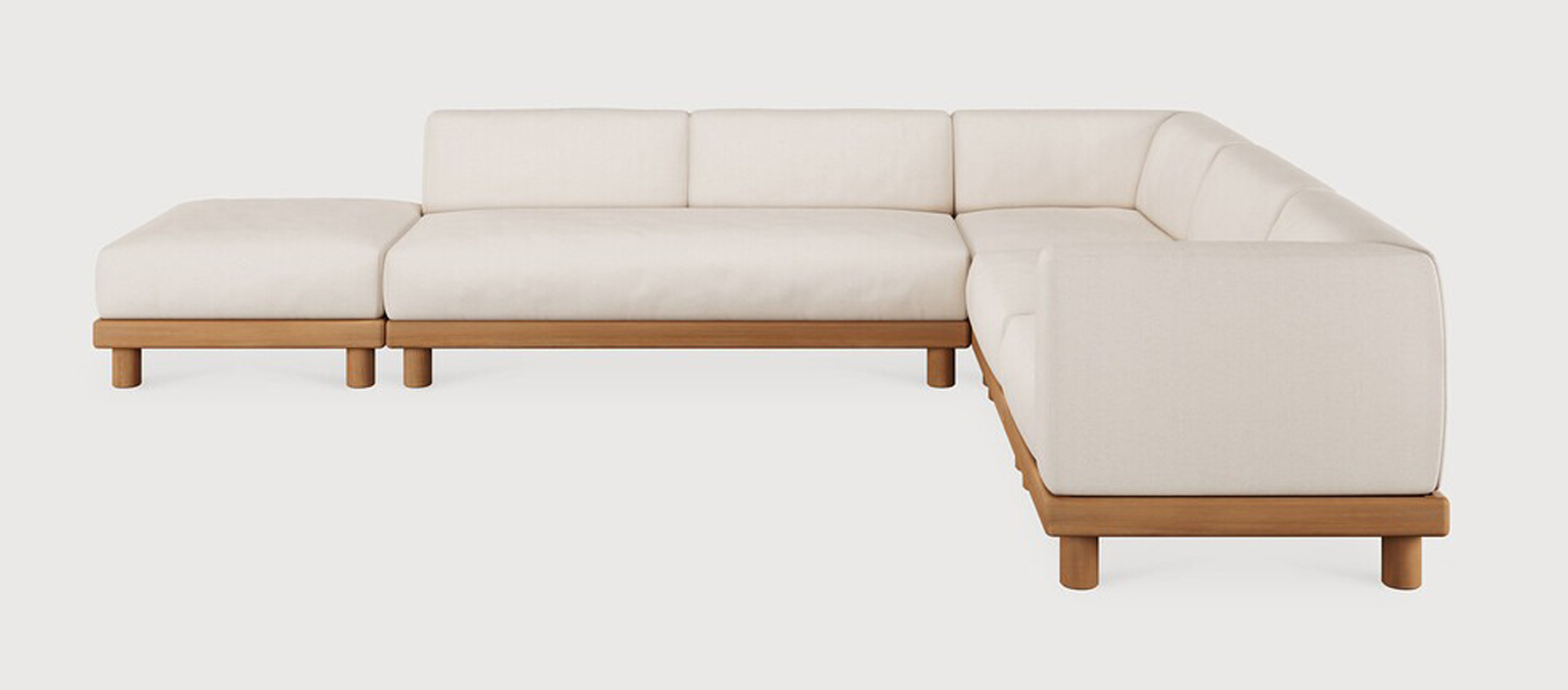 Ethnicraft Design. Jacques Deneef Dimensions : l 332 x h 72 x p 249 cm Combinant élégance et lignes épurées dans une silhouette décontractée, le canapé Monocle est raffiné, agréable et bien ancré au sol. Ses coussins moelleux vous permettent de profiter du confort de l'intérieur à l'extérieur, tandis que sa base en bois massif l'ancre bien au sol avec chaleur et équilibre. Faites votre choix parmi les options préconfigurées ou personnalisez votre installation et créez un canapé aussi unique que votre espace. Les cadres et les coussins peuvent être commandés ensemble ou séparément. Clips inclus pour relier les différents modules du canapé entre eux. Pour garantir la beauté naturelle du bois, ce modèle en teck n’a reçu aucune finition ni aucun traitement de protection. Pour plus d’informations, veuillez consulter nos consignes spécifiques pour l’entretien du mobilier de jardin. Fabriqués en 100% teck massif / Tissu 100% polyprop / Mousse à séchage rapide. canapé modulaire extérieur outdoor