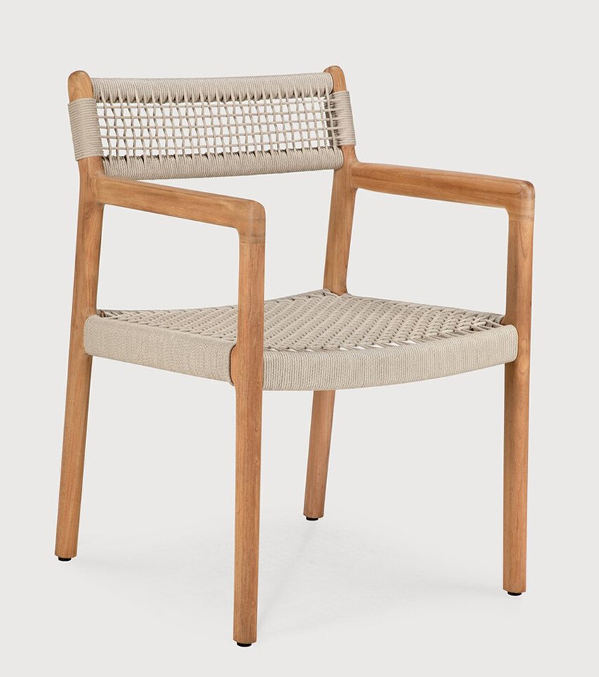 Ethnicraft Design. Jacques Deneef Dimensions : l 56 x h 81 x p 60 cm Élégante sous tous les angles, la collection Jack se définit par ses formes et ses courbes voluptueuses. Avec son assise et son dossier en tissage italien, complétés par un coussin sur mesure, la chaise de jardin est fabriquée en corde résistante à l'extérieur, mais convient également pour l'intérieur. Avec des lignes classiques épurées et une touche moderne, chaque détail a été méticuleusement travaillé pour vous assurer confort et élégance tout en profitant du grand air. Les chaises et les coussins peuvent être commandés ensemble ou séparément. Fabriqué en teck massif / Corde en fil multifilament 100 % polyprop. chaise extérieur outdoor