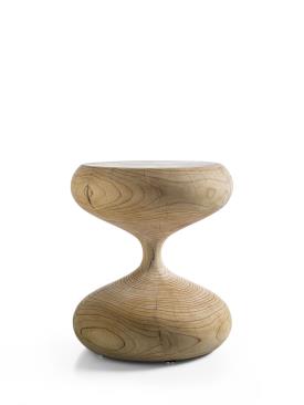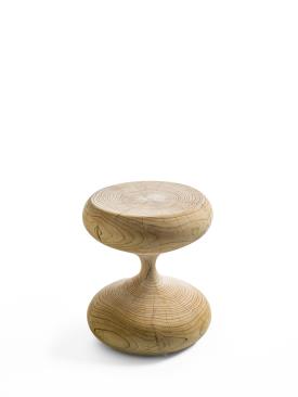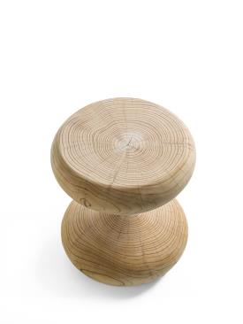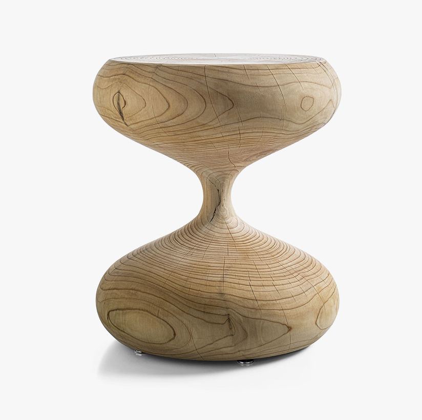 Riva 1920 Design. Authentic Design, 2025 Dimensions : Ø 40 x h 45 cm Tabouret en bois de cèdre massif odoriférant, fabriqué à partir d’un seul bloc , inspiré de la forme sinueuse d'un sablier en verre soufflé où la connexion centrale, apparemment élancée, représente en réalité un élément structurel solide. tabouret extérieur outdoor