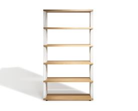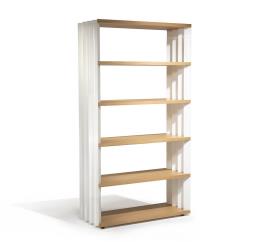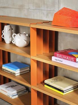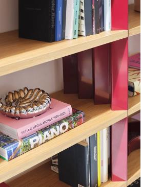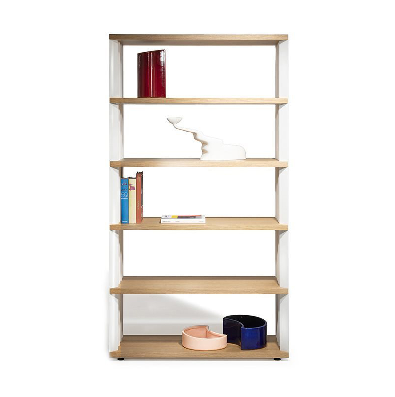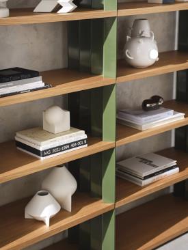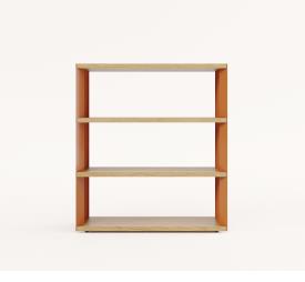 Structure en acier laqué poli, coloris talc, caramel, orange, amarante, algue. Étagères en MDF plaqué chêne naturel verni. Les bibliothèques hautes, placées côte à côte, peuvent être reliées par un système de fixation.