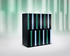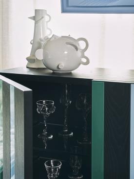 Structure en MDF plaqué frêne laqué à pores ouverts, noir ou amarante. Inserts en verre laqué vert menthe et bleu ciel pour la version noire, ivoire et corail pour la version amarante. Étagères intérieures réglables en verre trempé extra-clair. Possibilité d'intégrer un éclairage LED neutre à l'intérieur de l'armoire (sur demande).