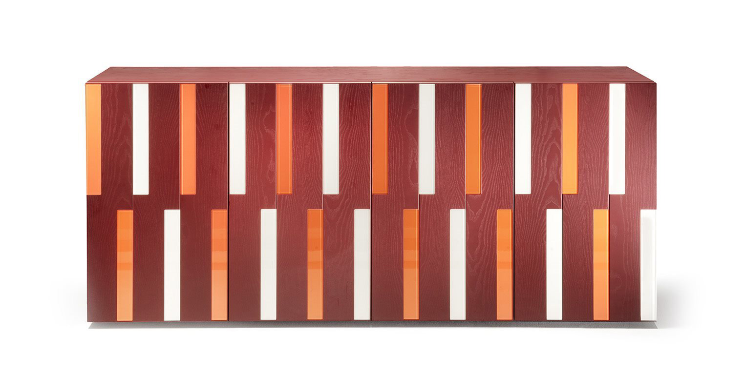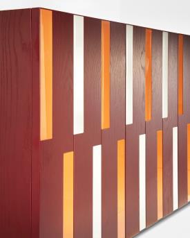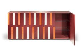 Structure en MDF plaqué frêne laqué à pores ouverts, noir ou amarante. Inserts en verre laqué vert menthe et bleu ciel pour la version noire, ivoire et corail pour la version amarante. Étagères intérieures réglables en verre trempé extra-clair. Possibilité d'intégrer un éclairage LED neutre à l'intérieur du meuble (sur demande).