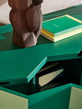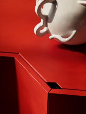 Meuble de rangement. Structure en MDF et panneaux de particules, laquée mate dans les coloris talc, cire, chanvre, caramel, orange, amarante, vert herbe, algue, expresso et noir. Étagères intérieures réglables en verre trempé. En option : intégration d’un éclairage LED neutre.