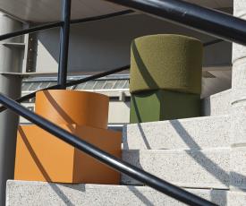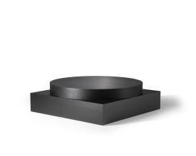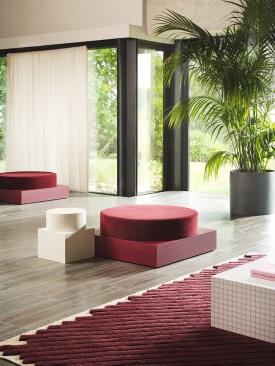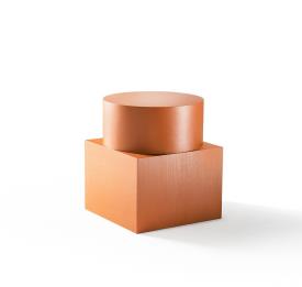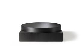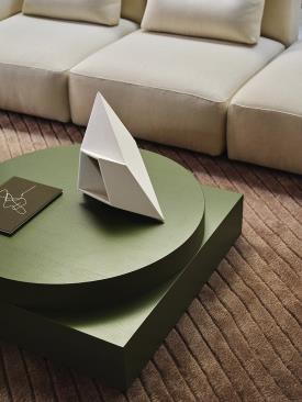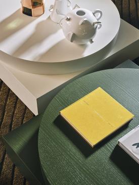 Design. Christian Woo - 2025 Dimensions : l 35/90 x h 28 x p 35/90 cm Structure en MDF plaquée de frêne laqué à pores ouverts, coloris talc, caramel, algue, amarante et noir. petite table