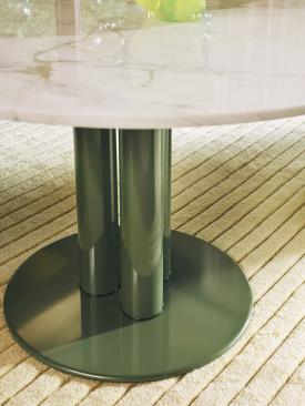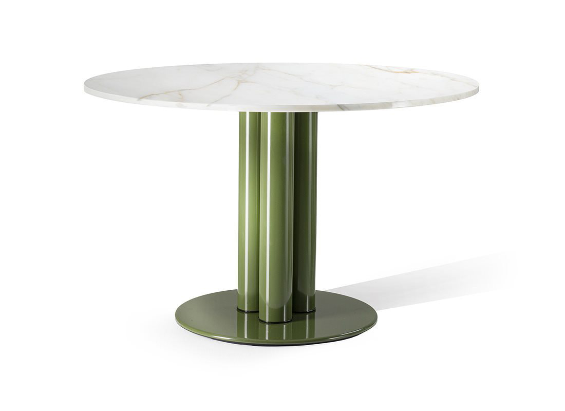 Table. Piètement et pieds en acier verni poli, coloris talc, chanvre, algues, amarante et expresso, associés à un plateau en marbre Calacatta.
