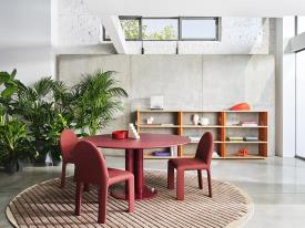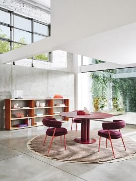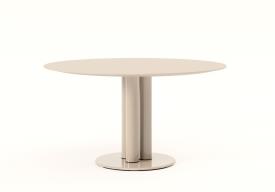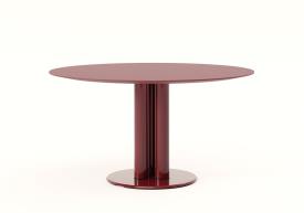 Table. Piètement et pieds en acier verni poli, coloris talc, chanvre, algues, amarante et expresso, associés à des plateaux en MDF laqué mat ou brillant dans les mêmes coloris.