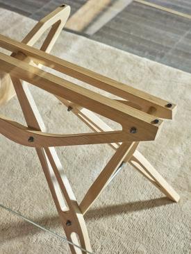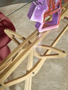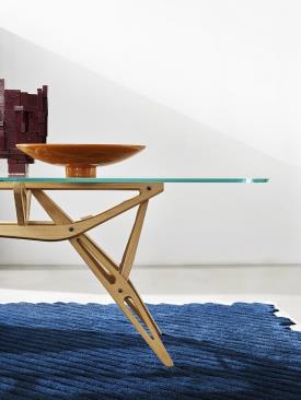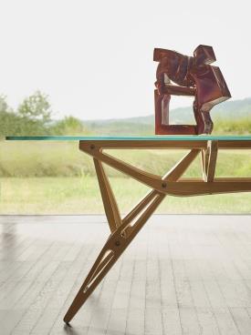 Structure en chêne massif naturel ou verni orange ou noir, ou en noyer Canaletto massif naturel, vernis à la cire. Plateau en verre extra clair, avec bords coupés inclinés, ou plateau en verre gris fumé, avec bords coupés inclinés, assorti à la structure en chêne noir.